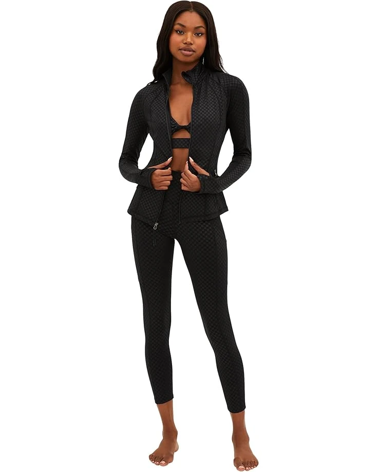 - Stay stylish and comfortable all day long donning the functional Beach Riot® Reina Running Jacket. The jacket has zippered front construction and long sleeves with thumbholes to keep the sleeves in place.