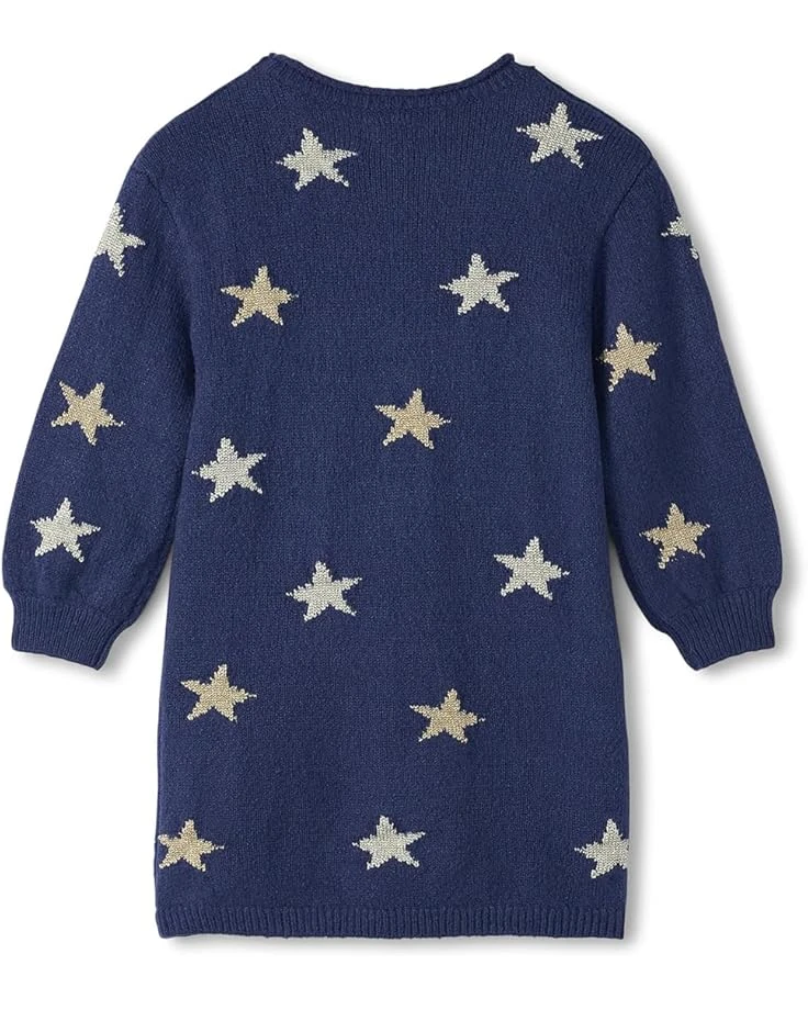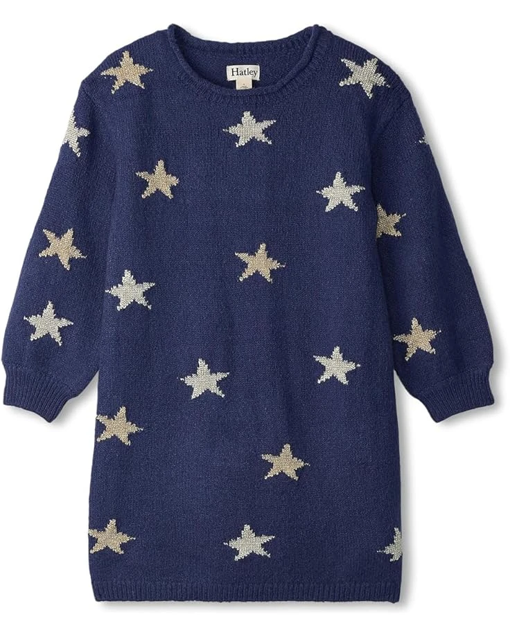- Add convenience and chic vibe to your casual style wearing the Hatley® Kids Blue Starlight Easy Sweater Dress. This relaxed pullover dress features a round neckline with set-in neck trim, long raglan sleeves finished with double set-in rib cuffs, and a below-the-knee silhouette with a straight ribbed hem. The allover star pattern gives the apparel an elevated style.