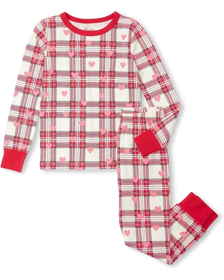 - Bedtime just became their favorite time of day in the Hatley® Kids Hearts Plaid Stretch Cotton Pajama Set! Perfect for cozy nights and sweet dreams, this long-sleeve, two-piece set features a charming graphic print and a crew neck finished with self-binding. Designed for ultimate comfort, it boasts a pull-on design, set-in self cuffs on the sleeves and legs, and a handy patch pocket at the chest. Crafted from extra-soft organic material with a stretchy elasticized waistband, this pajama set promises a snug fit and lasting comfort, making bedtime their new favorite time of day!
