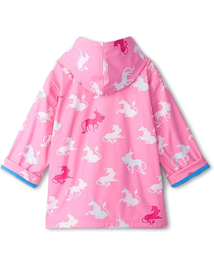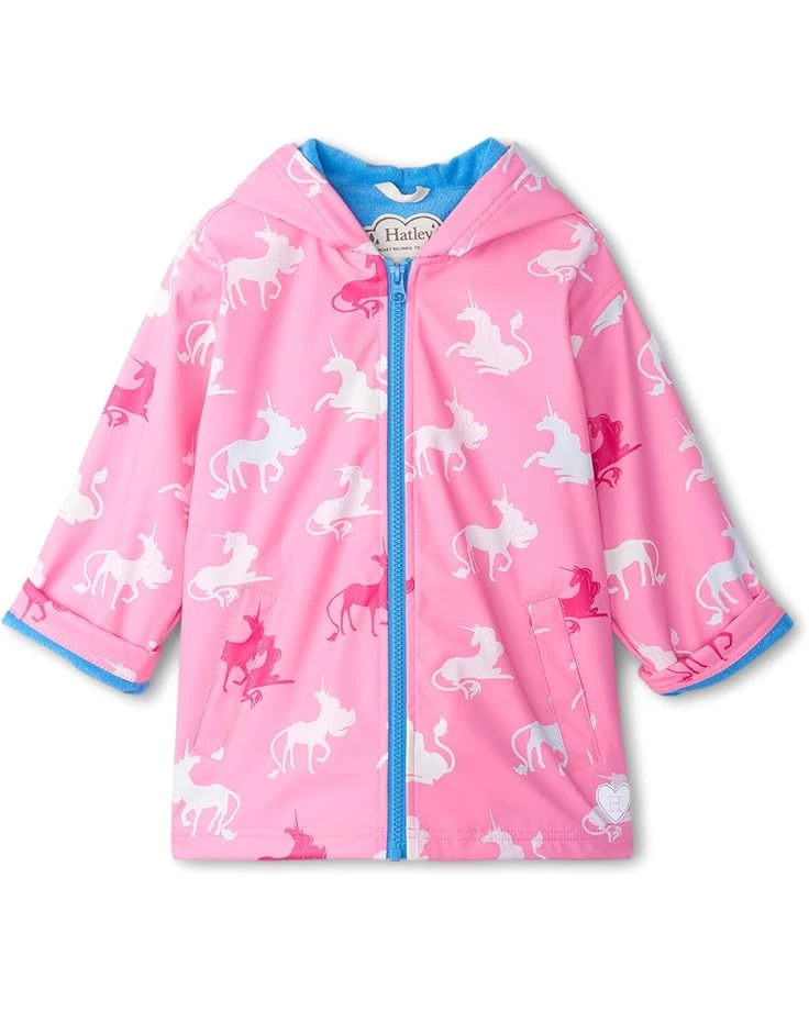 - Transform your normal style for magical rainy day adventures with Hatley® Kids Mystical Unicorn Zip Up Rain Jacket! Designed for joyous puddle splashing, it boasts waterproof, PVC-free enchantment. Fully lined for comfort, its durable construction guarantees enduring play. Zipper closure and an inside hanger loop make it both practical and whimsical for every rain-soaked escapade!