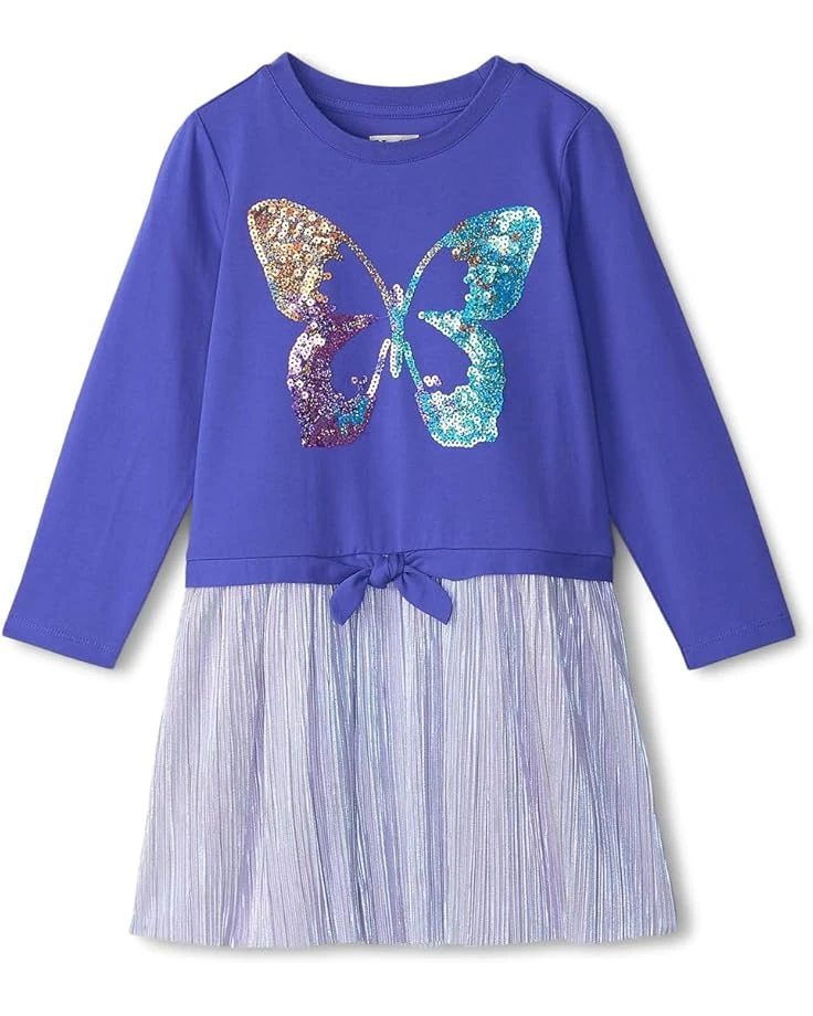 - Dress your little ballerina in the twirl-ready Hatley® Kids Sequin Butterfly Novelty Skirt Dress. Say goodbye to morning wardrobe dilemmas thanks to this drop waist tulle dress! Featuring a round neckline and a skirt with two layers of whimsical tulle, they’ll want to wear this one over and over (and over again). This fit and flare dress features round neckline finished with piping, short set-in sleeves with volume and elasticized, and piping at the sleeve opening, and a butterfly graphics on the front. It has concealed center-back zippered closure. Its skirt panel is shirred into the waist seam and hits below the knee.