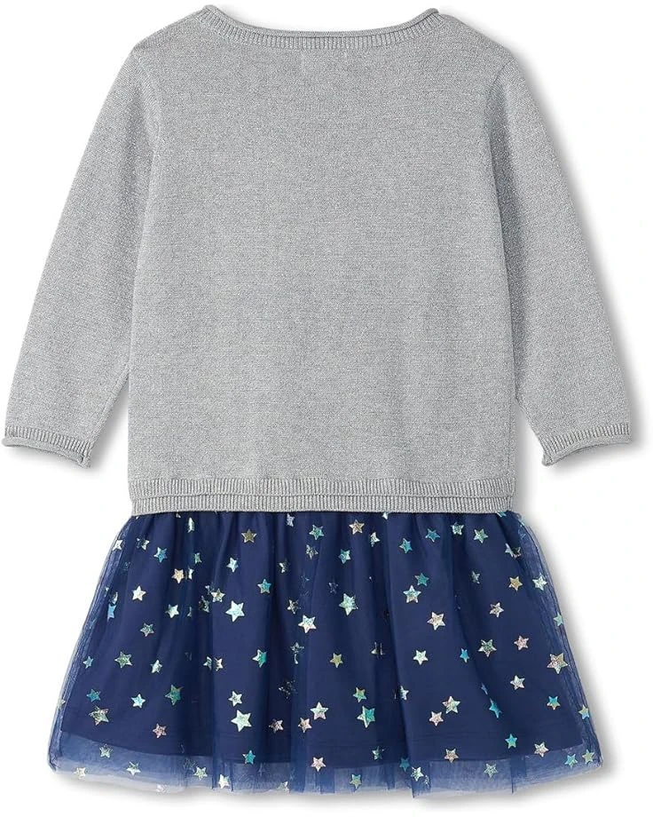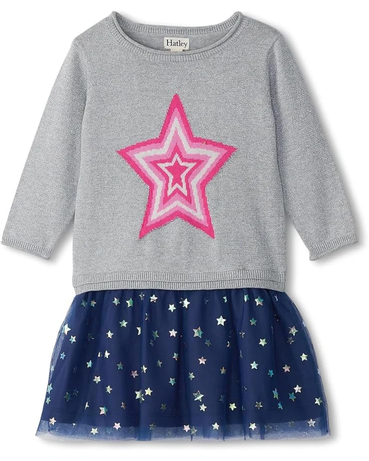 - Dress up in the most playful and chic Hatley® Kids Stargirl Dropped Waist Sweater Dress for casual days. This exquisite staple piece features a crew neckline, long sleeves, rib detailing & rolled edge at neckline and sleeves, star graphic on the front, and an allover printed tulle skirt that is intended to hit below the knees.