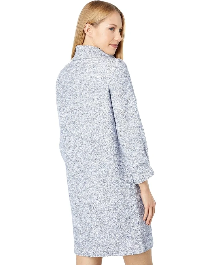 - Pullover sweater dress with three-quarter length sleeves and cowl neckline.